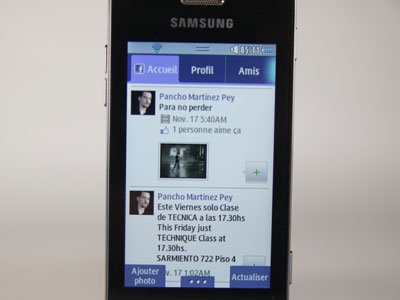 Le Wave 723 intègre Facebook et Twitter. Ces applications sont simplifiées mais demeurent efficaces. Facebook ne se lance point trop lentement. On fait défiler les actus des amis de façon fluide. Le confort de lecture est correct. On peut accéder à son propre profil, à sa liste d'amis, à ses messages. Et poster des photos. Facebook et Twitter sont aussi accessibles directement sur l'écran d'accueil, grâce à un widget qui fait défiler les actus des amis. Pratique.