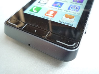 Les boutons du Wave 723 sont disposés aux emplacements habituels. Ils sont tous agréables à manipuler. On regrette seulement que les trois boutons situés au bas de l'écran ne soient accompagnés d'aucune indication. Le bouton de droite sert à raccrocher, ou à revenir à l'écran d'accueil. Le bouton de gauche à téléphoner. Le bouton central ouvre le menu d'applications. C'est une évidence pour beaucoup d'utilisateurs, mais pas pour tous. Les anciens propriétaires de Nokia ou de BlackBerry n'y sont pas habitués.