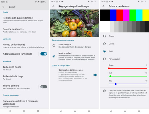 Ses bords sont plutôt épais. Ils le sont plus en haut et en bas de la surface d’affichage qui est totalement rectangulaire alors que sur tous les autres téléphones il englobe le poinçon (présent ici, mais que l’on ne voit pas, car intégré à la bordure supérieure). Comme le Pixel 6a de Google, l’écran du Sony Xperia 10 IV propose une fréquence de rafraîchissement maximale de 60 Hz. C’est peu surtout lorsqu’on sait que la concurrence propose du 120 Hz, beaucoup plus fluide et plus agréable à l’œil pour les défilements des pages et dans les jeux vidéo. Notez la possibilité d’activer le contrôle intelligent du rétroéclairage qui peut rester actif lorsque l’appareil détecte un visage. Deux modes de couleurs sont proposés : origine ou standard. C’est le deuxième qui propose les résultats les plus fidèles en termes de colorimétrie. Une option d’optimisation de l’image vidéo est disponible.