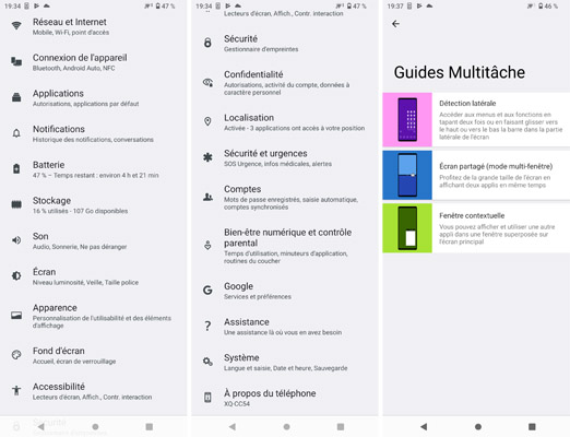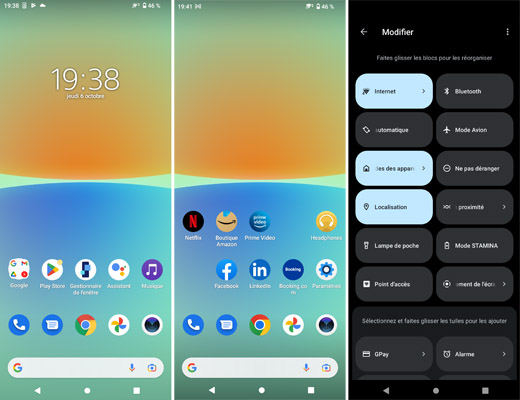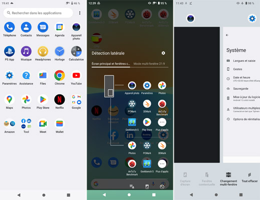 Une fois cette étape passée, le mobile propose une interface similaire aux autres mobiles de la marque. Plusieurs applications sont préinstallées comme PS App, Musique, Headphones, Netflix, Amazon boutique, Amazon Prime Video, Facebook, LinkedIn, Booking, Actualités. On sent qu’on est en possession d’un mobile orienté multimédia. Les raccourcis de fonctionnalités sont présentés de manière classique. Il est possible de déclencher l’affichage d’une barre latérale pour ouvrir rapidement une application préférée. Le gestionnaire d’applications présente plusieurs options, dont la possibilité de faire une capture d’écran, de lancer une fenêtre contextuelle, d’afficher plusieurs fenêtres ou de tout supprimer. Vous l’avez compris, il est possible d’avoir une fenêtre flottante à l’écran ou de scinder la surface d’affichage en deux pour profiter de deux applications simultanément.