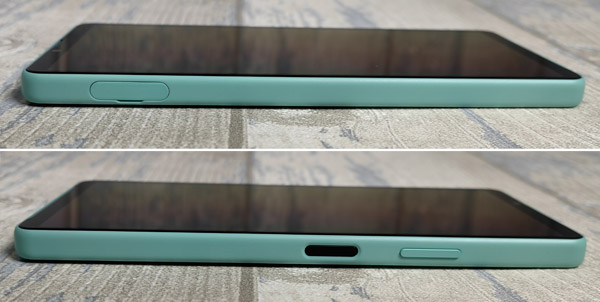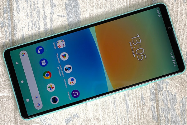 Si on fait le tour du mobile, on remarque que le bouton de mise en veille est noir par rapport à la tranche qui est, sur notre modèle de test, verte. Cela permet de l’identifier rapidement. Il contient le lecteur d’empreinte digitale. Celui-ci s’est avéré parfaitement réactif et n’a jamais failli lors de nos nombreux tests pour tenter de le mettre en défaut. Juste au-dessus, il y a le double bouton pour gérer le volume. Sur le profil supérieur, on trouve un microphone ainsi qu’un port audio jack pour brancher un casque directement. Sur le profil gauche en le regardant de face, il y a l’emplacement pour les cartes mémoires. Sony reste le seul fabricant à proposer une extraction avec l’ongle d'un doigt plutôt qu’avec un outil dédié. Le tiroir peut supporter deux cartes SIM ou une carte SIM et une carte mémoire de stockage, par exemple. Le système est protégé contre les infiltrations d’eau. Enfin, sur le profil inférieur, il y a le connecteur USB-C et un microphone. On ne voit pas de haut-parleurs comme c’est le cas sur les autres mobiles du marché. Non, pour diffuser le son depuis le bas ou le côté droit, selon la position du téléphone, celui-ci utilise un haut-parleur qui est dans l’épaisseur du bas de l’écran. Il est parfaitement intégré, comme celui du haut, d’ailleurs ce qui fait qu’on ne les voit pratiquement pas.