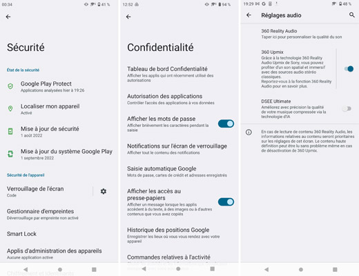 On apprécie le fait que le mobile soit compatible avec les formats audio haute qualité Hi-Res, LDAC, 360 Reality Audio (pour un son spatialisé), DSEE Ultimate (rehausse le niveau de la musique compressée, mais ne peut pas être utilisé simultanément avec le 360 Reality Audio), AAC, AAC+ et aptX.