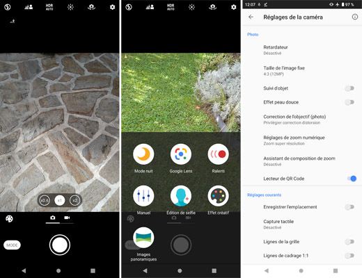 L’application Appareil photo est très complète avec plusieurs options dans la partie haute (flash, type de scène pour appliquer un flou, HDR, saturation et luminosité. Les modes de zoom 0,6x, 1x et 2x sont immédiatement disponibles. L’interface propose de soit prendre des photos en mode automatique, soit capturer une vidéo. Si on veut utiliser un mode spécifique, il faut ouvrir le menu correspondant, en bas à gauche de l’interface. On peut donc accéder à Mode nuit, Google Lens, Ralenti, Manuel, Edition de selfie, Effet créatif et Images panoramiques. Une fois sélectionné, le mode vient s’afficher au sein de l’interface pour y accéder plus rapidement par la suite.