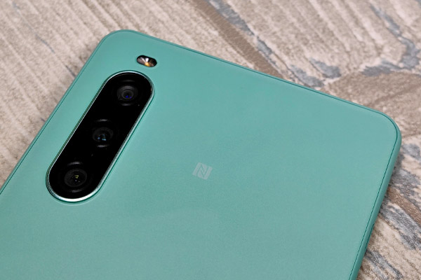 Dans le coin supérieur à gauche, il y a le bloc d’optiques qui est plutôt discret même s’il est sur un fond noir tranchant avec le reste de la couleur du dos (sauf pour le modèle noir). Les trois capteurs sont alignés verticalement tandis que le flash LED est déporté, juste au-dessus du bloc. Ce dernier ne dépasse presque pas par rapport à l’arrière de l’appareil, moins de 0,5 mm. Posé à plat sur un bureau, il n’est pas bancal. Toujours au dos, on remarque le logo NFC, Sony étant encore l’une des rares marques à faire mention de la présence de cette technologie et surtout d’indiquer où coller son téléphone sur les terminaux de paiement par exemple.