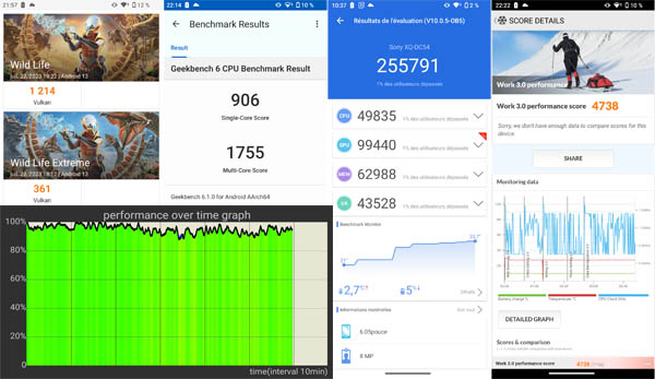 Afin de tester les performances brutes offertes par le mobile, nous l’avons soumis à plusieurs outils de mesure dont voici les principaux résultats. On peut remarquer que le processeur délivre toute sa puissance au fil du temps, ce qui est toujours une bonne chose. Nous n’avons pas constaté de surchauffe de l’appareil pendant nos tests, celui-ci restant tout à fait tempéré.