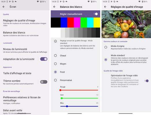 La définition est classique : 1080x2400 pixels. Dans les paramètres, on peut choisir entre le mode d’origine avec une représentation assez fidèle des couleurs ou le mode standard pour afficher des couleurs plus intenses. Il est possible de jouer sur la température de couleurs via la balance des blancs. L’écran adapte automatiquement sa luminosité qui est tout à fait suffisante pour un usage en extérieur.