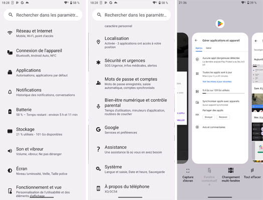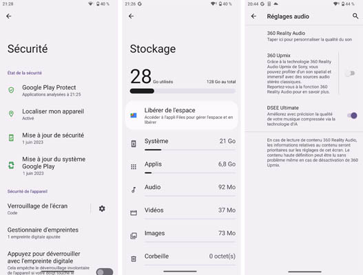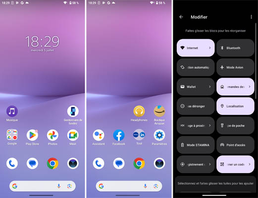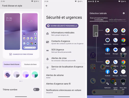 Le mobile propose une interface similaire aux autres mobiles de la marque. Plusieurs applications sont préinstallées comme Creators’ App, Musique, Headphones, PS App, Amazon boutique, Facebook, LinkedIn, Booking, Actualités. On sent qu’on est en possession d’un mobile orienté multimédia. Les raccourcis de fonctionnalités sont présentés de manière classique. Il est possible de déclencher l’affichage d’une barre latérale pour ouvrir rapidement une application préférée.
