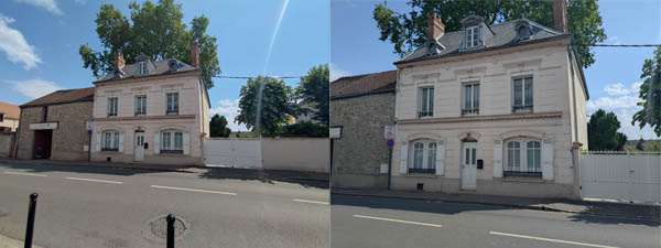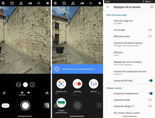 L’application Appareil photo est toujours aussi complète avec plusieurs options dans la partie haute (flash, type de scène pour appliquer un flou, HDR, saturation et luminosité. Les modes de zoom 0,6x, 1x et 2x sont immédiatement disponibles. Comme sur le précédent modèle, l’interface propose de prendre des photos en mode automatique, ou de capturer une vidéo. Si on veut utiliser un mode spécifique, il faut ouvrir le menu correspondant, tout en bas à gauche de l’interface. On peut donc accéder à Google Lens, Ralenti, Manuel et Images panoramiques, c’est tout. Une fois sélectionné, le mode vient s’afficher au sein de l’interface pour y accéder plus rapidement par la suite. Le mode Manuel permet de régler les moindres paramètres de la prise de vue, ce qui est très appréciable.