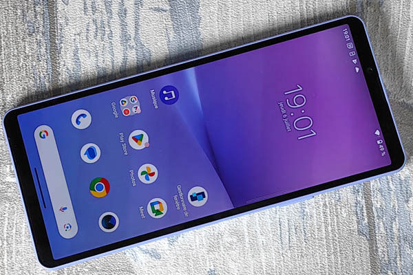 Si on fait le tour de l’appareil, on peut voir le bouton de mise en veille qui sert également de lecteur d’empreinte digitale. Celui-ci est tout à fait satisfaisant étant donné qu’il est rapide et qu’il a toujours su barrer la route à d’autres doigts que celui de notre testeur. Juste au-dessus, toujours à droite, il y a le double bouton pour gérer le volume. Sur le profil supérieur, on trouve un microphone et la prise audio jack qui permet de brancher un casque. Sur le profil gauche, il y a le tiroir à carte SIM. Celui-ci n’en supporte qu’une seule mais permet d’insérer une carte mémoire pour étendre la capacité de stockage de l’appareil. Rappelons que Sony est encore le seul fabricant qui propose un tiroir à carte SIM qui n’a pas besoin d’outil d’extraction, cette opération étant réalisable avec l’ongle d’un doigt. Le tiroir est protégé contre les infiltrations d’eau, ce qui nous amène au caractère totalement étanche de l’appareil puisque Sony l’a fait certifier IP68. Il est donc capable de résister à une immersion totale sous l’eau ainsi qu’à la poussière, comme le Samsung Galaxy A54 5G, le Google Pixel 6a ou le Nokia XR21. C’est une bonne chose, surtout à ce prix.