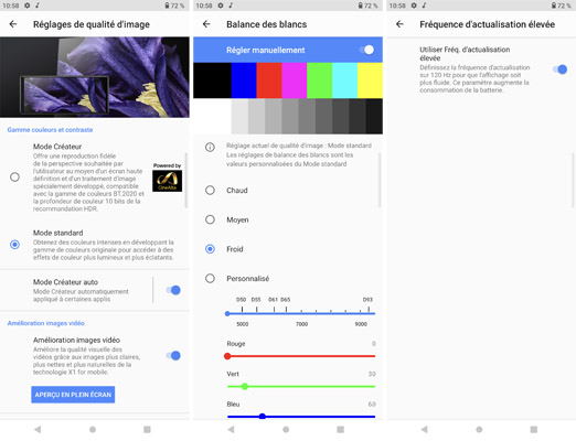 Le poinçon pour la caméra frontale est toujours inséré dans un bandeau noir qui occupe toute la largeur de l?écran. De ce côté, rien de bien nouveau donc. On peut accéder aux mêmes options que précédemment à savoir la possibilité d'activer l'un des modes de qualité d'image entre le mode créateur ou standard et potentiellement optimiser la qualité des vidéos. On peut également régler la balance des blancs et décider de passer en mode 120 Hz ou pas. À cela, Sony a ajouté la technologie Motion Blur Free qui permet d'avoir une fréquence de 240 Hz pour favoriser le rendu des mouvements rapides à l?écran. C'est très efficace et globalement, on profite d'un très bel écran sur le Xperia 5 III.