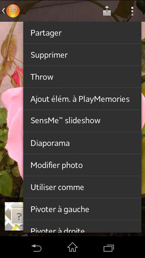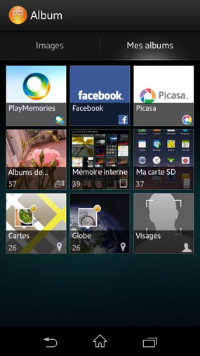 La visionneuse de photos se révèle d'un classicisme à toute épreuve. Son interface diffère de celle que l'on trouve de base dans Android. Elle est donc personnalisée par le constructeur, mais on retrouve les mêmes fonctionnalités. Sony propose aussi de consulter les photos stockées sur les réseaux sociaux de l'utilisateur directement dans la galerie d'images de l'appareil. Enfin, le service de stockage en ligne PlayMemories propre au constructeur est dans la veine d'un Dropbox, bien qu'il se révèle nettement moins ergonomique à l'usage.