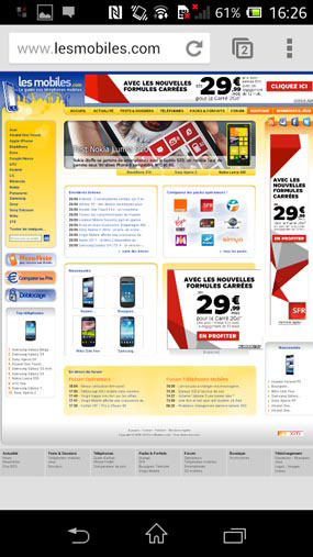 Parmi les rares fonctionnalités qui pâtissent un peu de cet afficheur, on note surtout le navigateur Web. Forcément, ce dernier prend moins ses aises lorsqu'il doit se contenter d'une telle définition. Ce qui est particulièrement dommage quand on sait que Sony a fini par évacuer son navigateur Web maison pour ne garder que le seul Google Chrome. Toutefois, en passant le smartphone en paysage, on arrive à minimiser le nombre de zooms et dézooms au sein d'une page Web. Ce qui est une bonne nouvelle, car pour le reste, Chrome s'avère parfaitement à son aise sur ce smartphone. Comme évoqué par ailleurs, il peut montrer des signes de ralentissement si vous abusez du nombre de fenêtres ouvertes. Mais si vous savez rester raisonnables et vous cantonner à quelques pages actives en parallèle, les performances du navigateur sont plutôt bonnes, avec une navigation fluide, même au sein des pages les plus chargées en contenu.