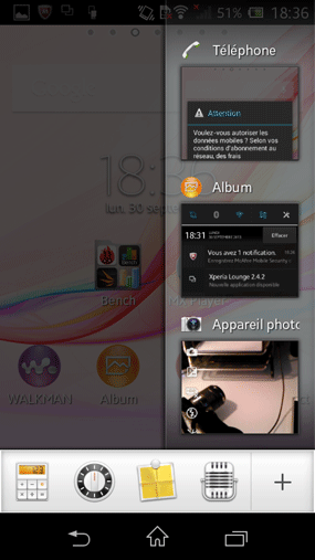 Les trois touches de navigation Android qui occupent ici le bas de l'écran assurent, elles aussi, différentes fonctions. Le gestionnaire de multitâche, à droite, donne accès à une liste de « micro-applis » flottantes, parmi lesquelles une calculatrice ou un bloc-notes par exemple, alors que le bouton Home permet lui de lancer Google Now, l'assistant de Google.