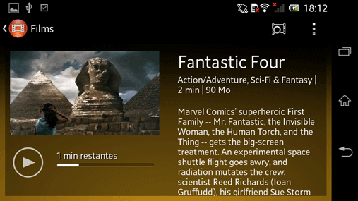 L'application Films qui remplace le lecteur vidéo d'Android apporte elle aussi son lot de réglages et autres options appréciables. Elle utilise notamment la base de données de Gracenote pour chercher automatiquement des informations complémentaires sur vos fichiers vidéo, comme le synopsis d'un film. Il faudra toutefois redoubler de motivation pour subir un film complet sur l'écran rikiki du Xperia M, malgré la qualité de l'affichage. MKV et MP4 passent comme une lettre à la poste jusqu'au 720p. Pour les fichiers 1080p, il faudra étrangement en passer par un lecteur tiers, dont regorge le Play Store, et faire avec des saccades pour le moins désagréables. Voilà finalement les faiblesses du processeur de Qualcomm exposées au grand jour. Qu'importe puisque cela n'a pas grand intérêt sur un écran WVGA, sans parler de l'espace de stockage requis pour de tels fichiers.