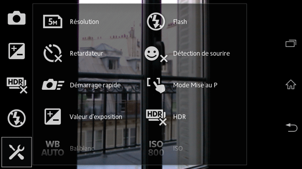 Outre les différents modes scènes proposés (10 au total), l'utilisateur aura le choix entre toute une batterie de réglages et autres options mis à sa disposition. Du choix de la résolution (maximale : 2592 x 1944 pixels) à l'ajustement de l'exposition, de la balance des blancs ou même de la sensibilité en passant par le mode HDR, l'Xperia M a tout d'un grand. Différents modes de déclenchement sont également prévus puisqu'il pourra se faire à la détection d'un sourire, au toucher ou bien évidemment via le déclencheur physique en deux temps qui trône sur la tranche droite du terminal. Un mode Panorama par balayage ainsi que de nombreux effets prévisualisables directement dans le viseur sont également proposés. Largement de quoi laisser libre court à votre sens artistique.