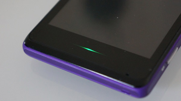 Sony s'est largement inspiré de ses autres terminaux pour façonner son Xperia M. Alors que ses angles droits et son bouton ON/OFF protubérant en aluminium rappelle son catalogue 2013, certains détails devraient raviver des souvenirs un peu plus anciens chez certains. C'est sous l'écran que se situe le premier, prêt à s'illuminer de multiples couleurs (blanc, turquoise, vert, bleu, jaune, rouge ou violet) au moindre événement, selon les fonctions et contacts que vous lui avez associés. Voilà qui nous rappelle un certain Xperia U. Le constructeur a en effet utilisé l'espace disponible entre l'écran et le bord inférieur pour y dissimuler une LED de notification, en lieu et place des habituelles touches de navigation Android que l'on trouve encore chez certains de ses concurrents. Celles-ci grignoteront ici une partie de l'affichage, qui occupe sans surprise la majorité de la face avant. A l'opposé se situent les capteurs de luminosité et de proximité ainsi que la webcam et le haut-parleur.