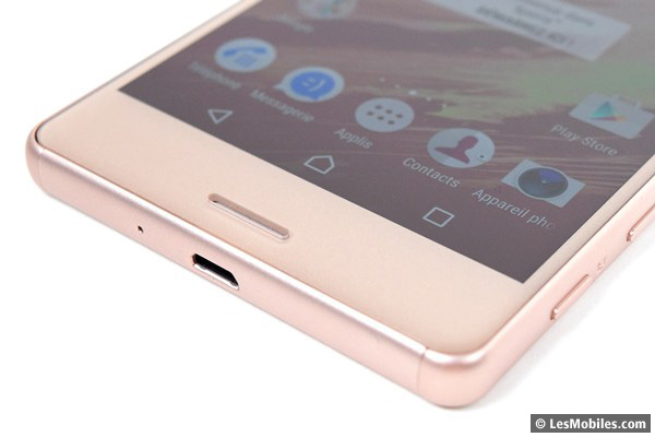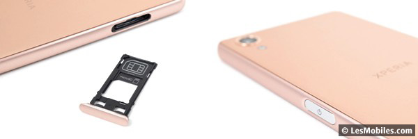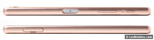 Comme avec le Xperia Z5, nous retrouvons avec plaisir le déclencheur mécanique pour l'appareil photo. À ces côtés, toujours un peu trop bas à notre goût, se trouvent les contrôles du volume. Pour finir avec la description des côtés du téléphone (dont la partie couvrant la tranche inférieure semble être en plastique), nous retrouvons en bas un port microUSB (et non Type-C réversible), en haut le port jack 3,5 mm et à gauche le tiroir pour la SIM (pas de dual SIM) et la microSDXC. Notez que l'extraction du tiroir est impossible à chaud : le mobile redémarre automatiquement si vous l'enlevez. C'est dommage, car l'accès à la carte mémoire nécessite donc de rebooter le téléphone.