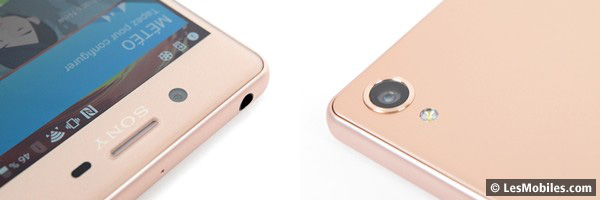 À l'avant, nous retrouvons une dalle de 5 pouces comparable à celle du Xperia M5. Les bordures sont très légèrement plus fines autour de cet écran. L'emplacement des capteurs et des éléments techniques est similaire aux habitudes de la marque. Les haut-parleurs situés autour de l?écran sont bien visibles, comme sur le Xperia X Performance, et non plus cachés dans l'interstice entre la dalle tactile et le contour métallique (comme c'est le cas avec le Z5, le XA, le XA Ultra ou le E5... Comprenez ce que vous pourrez).