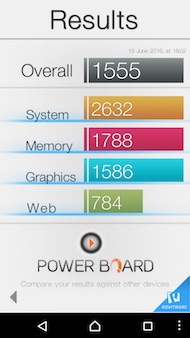 Commençons avec AnTuTu v6 : il obtient avec le Snapdragon 652, un écran Full HD et 3 Go de RAM, 77568 points. Un score qui le positionne quelques milliers de points en dessous du Xperia Z5, du Huawei P9 ou du Meizu Pro 6. Comme attendu, le SD652 est moins puissant que le SD810. Il est aussi en retrait face aux Kirin 950/955 de HiSilicon et au MT6797 de MediaTek. Sur Basemark OS II, il obtient 1555 points. Encore une fois, il est derrière les Kirin (sans parler du SD810), mais devant l'octo-core haut de gamme de MediaTek.