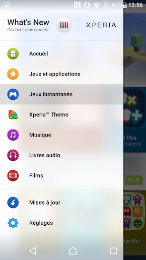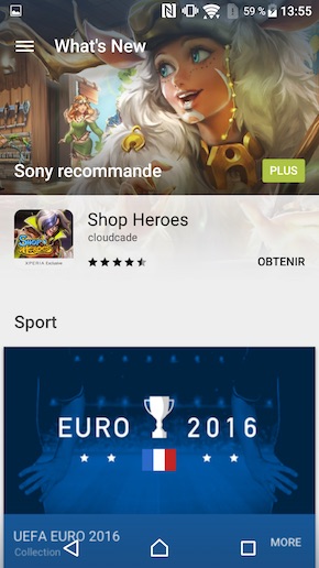 Certaines applications maison ont également été supprimées pour laisser plus de place à la personnalisation. Comparable à Samsug Apps, mais également à iTunes (car la place de marché propose aussi des films, de la musique, des livres audio), What?s New conserve son rôle de place de marché marketing où les utilisateurs retrouvent les logiciels développés par Sony, mais aussi d'autres produits liés à des accords commerciaux. Shop Heroes, un jeu où vous êtes les propriétaires d'une échoppe dédiée aux aventuriers typés « heroic fantasy », en est un exemple parmi d'autres.