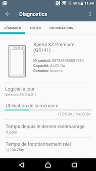 Les performances du smartphone sont excellentes, bien supérieures à celle des autres Xperia haut de gamme, mais également d'un grand nombre de terminaux commercialisés précédemment. Des performances aussi bien dans la puissance du smartphone (capacité à gérer des applications ou des contenus gourmands en ressources) que dans sa propension à offrir une autonomie digne de ce nom. Sans parler des modes Stamina déjà croisés dans les Xperia précédents, le Xperia XZ Premium bénéficie d'une batterie de 3250 mAh qui offre une autonomie de 8 heures d'utilisation en continu, soit plus d'une journée d'usage normal, pratiquement comme le Galaxy S8. Et c'est une double performance, car le système est gourmand (14 Go d'espace) et la moitié du volume de mémoire vive environ est utilisée en permanence.