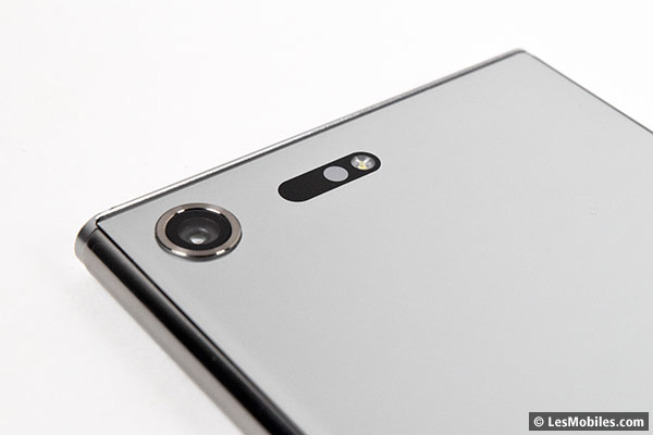 À l'arrière, rien de bien étonnant puisque les deux éléments visibles sont positionnés comme sur le Xperia X Compact : capteur photo rond coincé dans un coin, flanqué à sa droite d'un bloc combinant le flash et le capteur infrarouge de l'autofocus hybride. Sur la tranche de droite, nous retrouvons le bouton de mise en marche, cachant, comme sur le Xperia XZ, le lecteur d'empreinte digitale. Il est accompagné du contrôle du volume et du déclencheur photo (qui sert aussi à ouvrir l'application associée).
