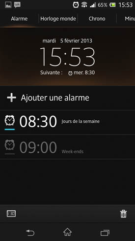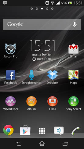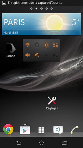 L'interface, d'ailleurs, parlons-en. Nous retrouvons sur le Xperia Z le modèle préconisé par Google, c'est-à-dire un smartphone sans bouton physique ou tout se passe à l?écran. En d'autres termes, vous aurez une barre noire en bas avec des boutons de fonction qui changeront selon les applications. A gauche, vous accédez au multitâche et à une sélection de widgets qui s'afficheront par-dessus tous les écrans, du bloc note à l?horloge. A droite, vous aurez un bouton retour ou « masquer le clavier ». Au centre se trouve l?éternel bouton Home, qui vous ramènera sur la page d'accueil.