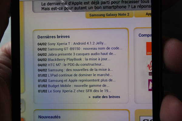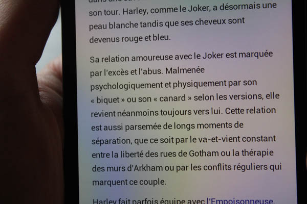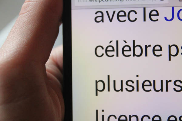 De manière générale, vous apprécierez grandement les polices ultra fines, vraiment agréables à l??il. On a l'impression d?être face à un texte imprimé ou un trait de stylo plus qu?à un écran. Naviguer sur Internet n'a jamais été aussi plaisant que sur cet appareil. Les longs articles se lisent très bien, les paragraphes étant particulièrement nets même avec un niveau de zoom très réduit. Du côté de la photo et de la vidéo, c'est la colorimétrie que l'on pourra encenser, très fidèle, ne saturant vers aucune couleur. L?AMOLED a tendance à virer au bleu, le TFT du Xperia Z n'a pour ainsi dire pas de défaut en dehors de ses noirs peu profonds. En plus, vu la taille de l?écran, parcourir vos photos est un vrai régal sur ce smartphone qui pourra devenir l'ami des photographes cherchant un moyen de partager rapidement les clichés pris en vadrouille avec leur reflex.