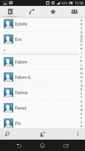 Vous retrouverez bien entendu la numérotation intelligente, qui vous permettra de retrouver des contacts en appuyant sur les touches numériques de l'application « Appel ». Très pratique pour appeler rapidement quelqu'un sans taper son nom ou chercher son contact. D'ailleurs, les contacts sont, comme toujours sur Android, synchronisés avec votre compte Gmail, ce qui vous enlève le stress de les perdre un jour : quel que soit votre futur smartphone, vous les retrouverez instantanément. Rien que du classique de ce côté-là niveau affichage, vous accédez aux fiches de vos contacts et vous les utilisez pour envoyer des SMS ou passer des appels.