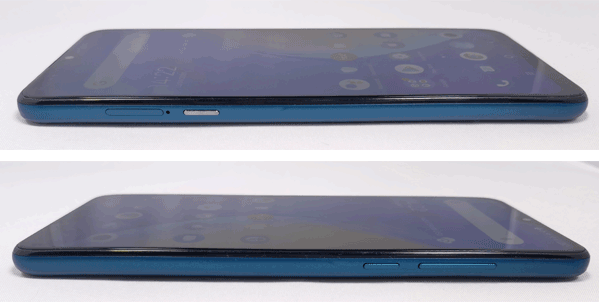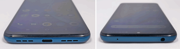 Les profils du mobile sont en plastique avec un léger décrochage au niveau des boutons pour lui conférer un aspect plus profilé. Sur le côté droit, il y a le bouton d'alimentation ainsi que la touche pour gérer le volume. Sur le côté supérieur, il y a un port audio jack 3,5 mm pour brancher un casque. Habituellement, on trouve ce type de connecteur plutôt sur le profil inférieur. Là, il est finalement plus pratique, car cela permet d'avoir le mobile dans le sens de la hauteur dans la poche. Sur le côté gauche, on trouve l'emplacement pour les deux cartes SIM ou une carte mémoire et une carte SIM. Il y a également un bouton pour lancer l'assistant Google. Enfin, sur le profil inférieur, il y a deux grilles alors on pense avoir affaire à deux haut-parleurs. En réalité, c'est uniquement esthétique, car il n'y a qu'un seul haut-parleur, l'autre grille est là pour assurer une cohérence autour du connecteur USB-C en position centrale pour recharger l'appareil.