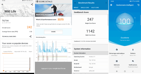 Nous avons soumis le TCL 20 SE à plusieurs outils de mesure de performances dont voici les principaux résultats. Après plusieurs longues minutes de tests, le mobile reste tempéré ce qui est toujours une très bonne chose et promet une certaine longévité.