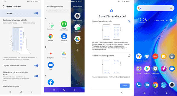 Un module de recherche est présent tout en haut de l?écran. La surcouche TCL permet de pouvoir utiliser une barre latérale comme sur certains Samsung, par exemple. Ainsi, on peut y intégrer des icônes d'applications, des contacts et des fonctions pour pouvoir y accéder plus rapidement. La barre s'affiche assez haute par défaut, mais il est possible d'en changer la position pour « l'attraper » plus facilement.