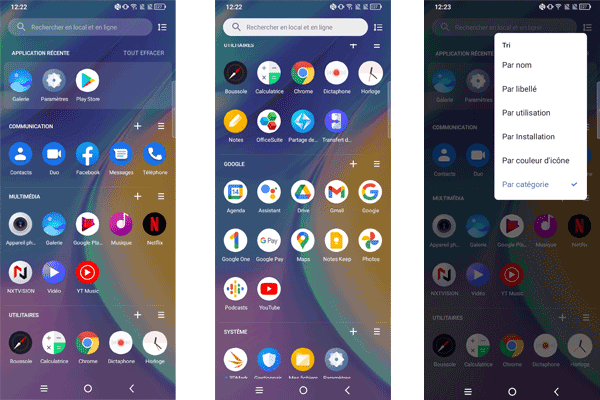 Le TCL 20 SE est animé par Android 11. Il profite également d'une surcouche logicielle développée par les équipes de TCL, en version 3.0.2 au moment de notre test. Celle-ci propose des icônes originales ainsi qu'une organisation un peu différente des menus des paramètres que l'on peut voir d?habitude sur les autres smartphones sous Android. Mais ce qui marque le plus, c'est le classement (par défaut) des applications. Disponibles au sein d'un tiroir, elles sont organisées par catégorie alors qu?habituellement, elles sont classées par ordre alphabétique. On trouve donc dans l'onglet Communication, les applications Contacts, Duo, Facebook, Messages et Téléphone. On peut personnaliser cette organisation en renommant et classant différemment les catégories et en ajouter d'autres.