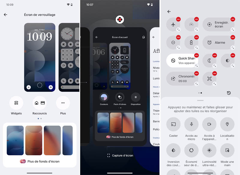 L'interface Nothing OS 3.1 est l'une des surcouches Android les plus épurées du marché, avec un design minimaliste et distinctif. Les icônes stylisées en noir et blanc et les widgets uniques donnent au téléphone une identité visuelle forte. Pour ceux qui trouveraient cette interface trop déroutante lors des premières utilisations, il est possible de basculer vers un mode d'affichage où les icônes des applications retrouvent leurs couleurs originelles. L'interface offre plusieurs options de personnalisation, notamment « Activate Smart Drawer », qui organise toutes les applications dans le tiroir d'applications par catégorie au lieu de les classer par ordre alphabétique. Il est également possible d’activer les étiquettes d'applications pour une identification plus facile et personnaliser l'écran de verrouillage et le menu des paramètres rapides selon leurs préférences.