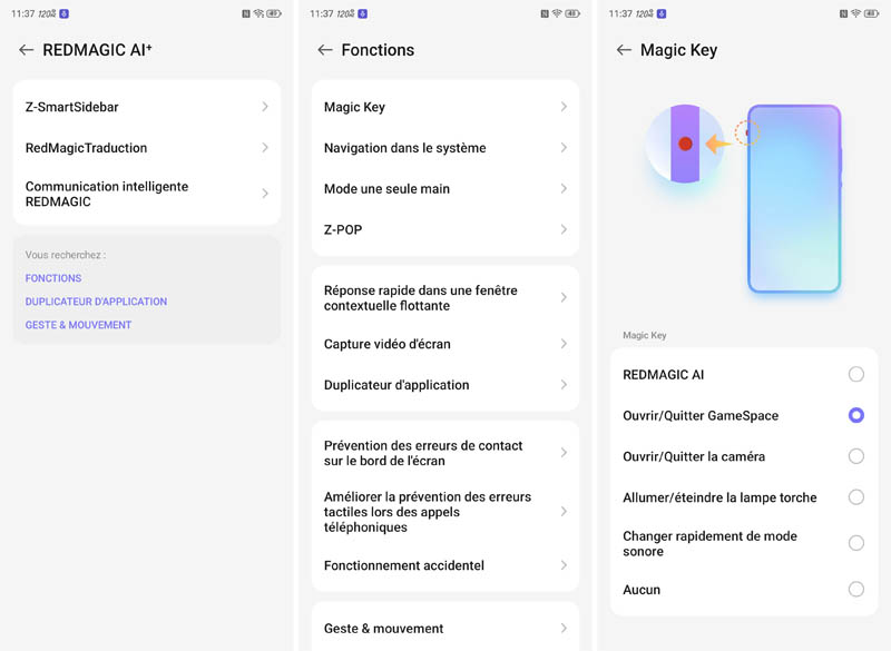 Les matériaux utilisés sont de qualité, avec une sensation de solidité rassurante. Les bordures d’écran sont fines, ce qui maximise la surface d’affichage sans sacrifier l’ergonomie. La disposition des boutons est classique, avec un accès facile au bouton d’alimentation qui est parfaitement rond, ce qui est assez original. La barre de gestion du volume est placée juste au-dessus. De l’autre côté, il y a un autre bouton rond, rouge, celui-ci. Baptisé Magic Key, il permet de lancer une action au choix (RedMagic AI, ouvrir le GameSpace, la caméra, la lampe torche ou changer rapidement de mode sonore). Les gâchettes tactiles, exclusives à la gamme RedMagic, tombent naturellement sous les doigts et offrent un avantage indéniable en jeu.
