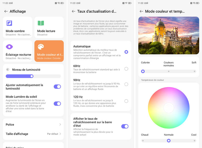La luminosité maximale permet une bonne lisibilité en extérieur, même sous un soleil direct. Les couleurs sont vives, les noirs profonds et le contraste élevé, comme on peut l’attendre d’une dalle AMOLED de ce niveau. Le calibrage d’usine est satisfaisant, mais il reste possible de personnaliser les paramètres d’affichage (température des couleurs, mode nuit, filtre de lumière bleue) selon ses préférences.