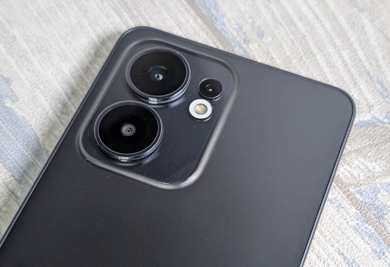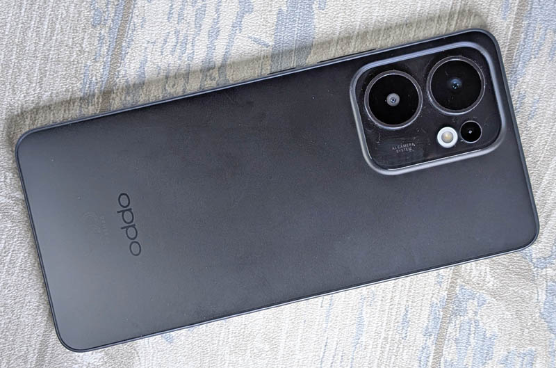 Le dos du smartphone présente un traitement de surface différent selon les coloris. Notre modèle de test, en version Graphite, propose un effet mat satiné qui limite considérablement les traces de doigts tout en offrant des reflets subtils selon l'angle de lumière. Le Reno13 FS est également disponible en bleu foncé et violet. Les finitions sont soignées et l'assemblage ne souffre d'aucun défaut apparent. Le module photo, disposé dans le coin supérieur gauche, adopte un design en îlot légèrement proéminent mais suffisamment discret. Notez que le contour peut s'allumer pour signaler l'arrivée d'une notification.