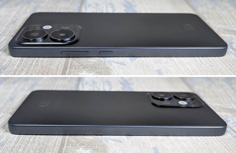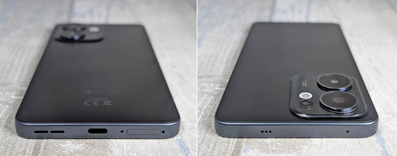 Les tranches du Reno13 FS sont très légèrement arrondies, ce qui améliore la prise en main et l'ergonomie générale. Le cadre en plastique est agréable. Sur la tranche droite, on retrouve le bouton de mise en veille ainsi que les touches de volume, tous parfaitement accessibles lors d'une utilisation à une main. La tranche inférieure accueille le port USB-C, le tiroir pour carte SIM et microSD, ainsi qu'un des deux haut-parleurs stéréo. Le téléphone supporte deux cartes SIM ou une seule et une carte de stockage. Attention à ne pas confondre l’orifice pour extraire le tiroir et celui du microphone car les deux sont situés de part et d’autre de l’emplacement pour les cartes.
