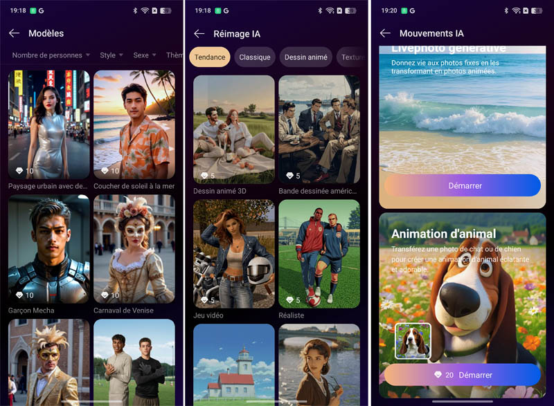 Notez aussi la présence de l’application AI Studio. Celle-ci permet de générer des images inédites en fonction des photos que vous avez pu prendre notamment en portrait, réinventer des images selon des thèmes (Tendances, Classique, Dessin animé, Texture ou Dessin). Il est également possible de donner vie à des photos fixes en transformant en images animées et de générer une animation d’un chien ou d’un chat. Les créations passent par l’utilisation de crédits.