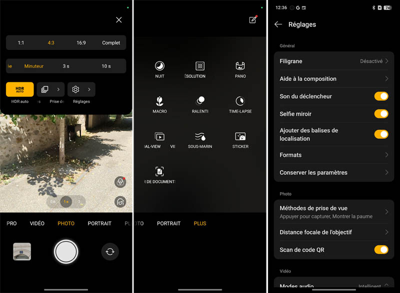 L'interface de l'application appareil photo d'Oppo est intuitive et bien pensée. Les différents modes de prise de vue sont accessibles par simple glissement horizontal, tandis que les paramètres avancés se trouvent dans un menu dédié. Les options les plus courantes comme le flash, le HDR ou les filtres sont directement accessibles depuis l'écran principal. Les niveaux de zoom sont facilement sélectionnables via des boutons dédiés (0,6x pour l'ultra grand-angle, 1x pour le capteur principal, et jusqu'à 10x en zoom numérique).