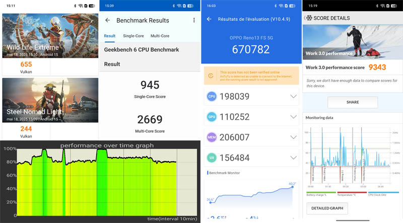Pour le gaming, le Reno13 FS se montre capable de faire tourner la plupart des jeux du marché avec des réglages moyens à élevés. La gestion thermique s'est révélée efficace lors de notre test, avec une chauffe modérée même après des sessions de jeu prolongées.