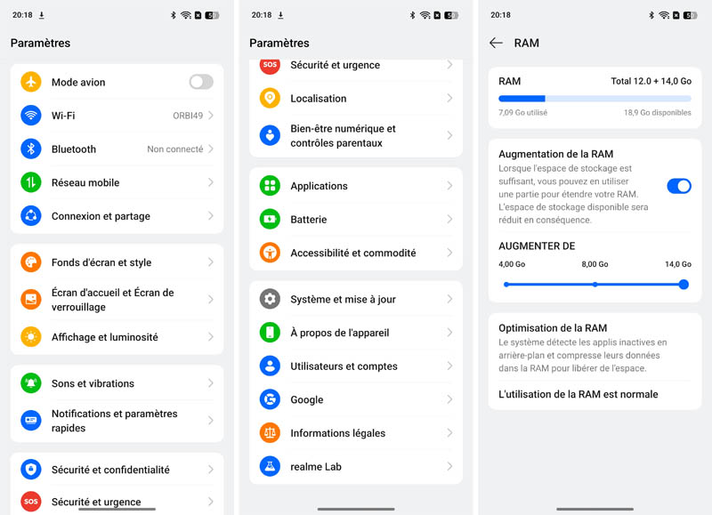 L'interface realme UI 6.0 apporte plusieurs nouveautés par rapport aux versions précédentes. La plus notable est la séparation du panneau de notifications et du centre de contrôle, à la manière d'iOS. Rappelons qu’un glissement vers le bas depuis la partie gauche de l'écran affiche les notifications, tandis qu'un glissement depuis la droite ouvre les paramètres rapides. Pour ceux qui préfèrent l'ancienne organisation, il est cependant possible de revenir au système unifié.