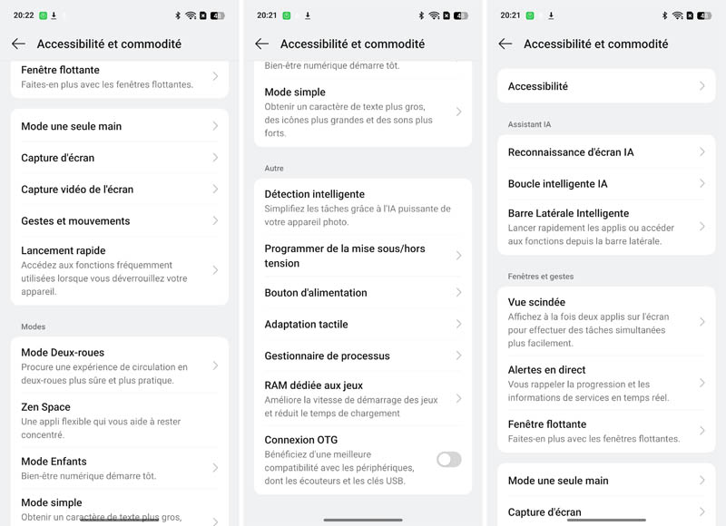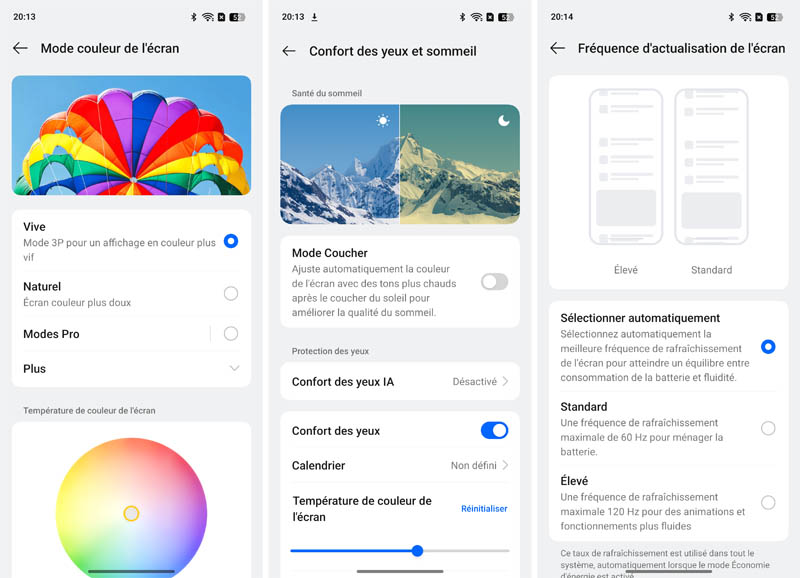 La fréquence de rafraîchissement de 120 Hz est l'un des points forts de cet écran. Dans les menus et lors du défilement des pages web ou des réseaux sociaux, la fluidité est exemplaire, sans aucun à-coup visible. Le smartphone propose trois options de rafraîchissement : 60 Hz pour économiser la batterie, 120 Hz pour une fluidité maximale, ou un mode automatique qui adapte intelligemment la fréquence selon le contenu affiché. En outre, le taux d'échantillonnage tactile de 240 Hz assure quant à lui une réactivité immédiate à chaque interaction, particulièrement appréciable dans les jeux qui nécessitent des réflexes rapides.