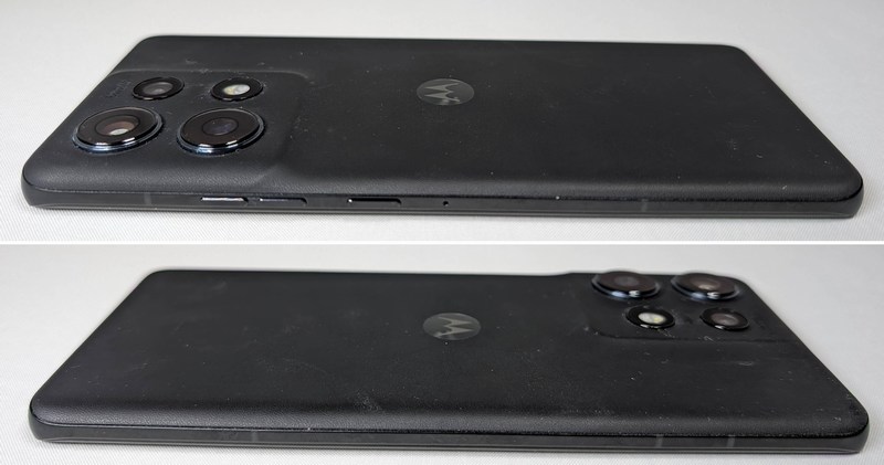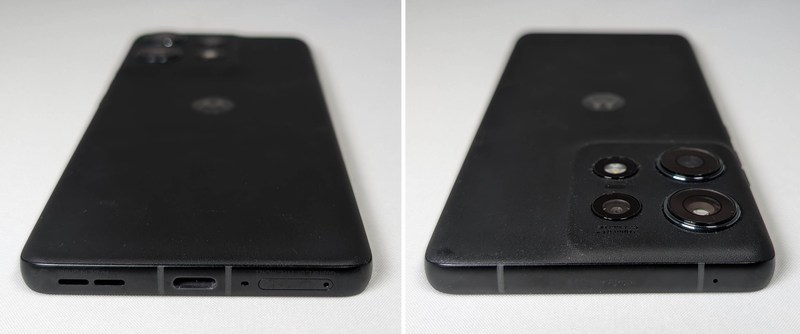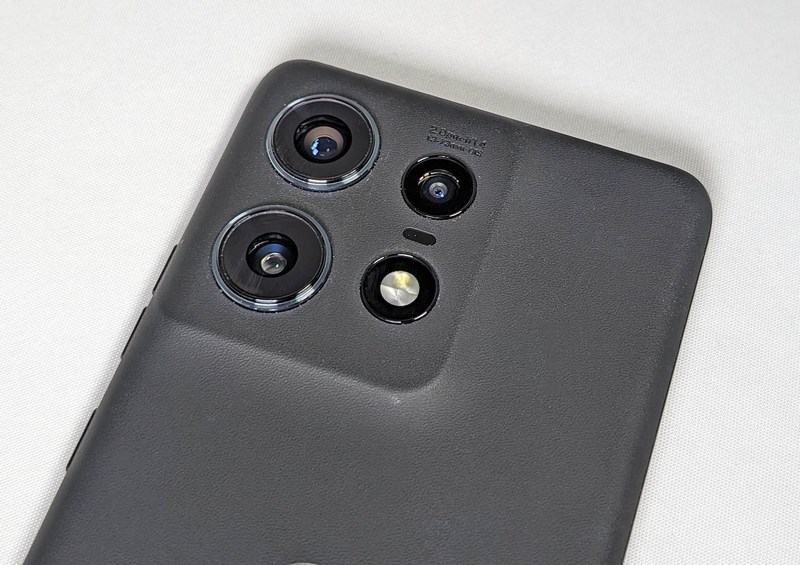 Dans le coin supérieur, à gauche, comme la quasi-totalité des smartphones, il y a les capteurs photo qui sont installés derrière un petit effet bombé prolongeant le revêtement arrière. Les deux capteurs principaux sont alignés verticalement tandis que les autres terminent de former un carré quasi parfait. Globalement, nous apprécions beaucoup le design du Motorola edge 50 Pro.