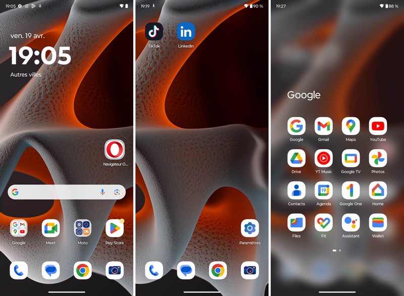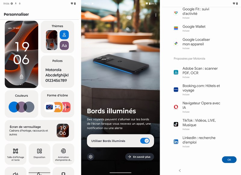 Rappelons la présence des applications Ready For (affichage sur un moniteur), Moto Secure ainsi que Family Space pour gérer son environnement familial numérique. Outre les applications Google, il y a aussi les applications tierces, Adobe Scan, Booking.com, Facebook, LinkedIn, Opera et TikTok.