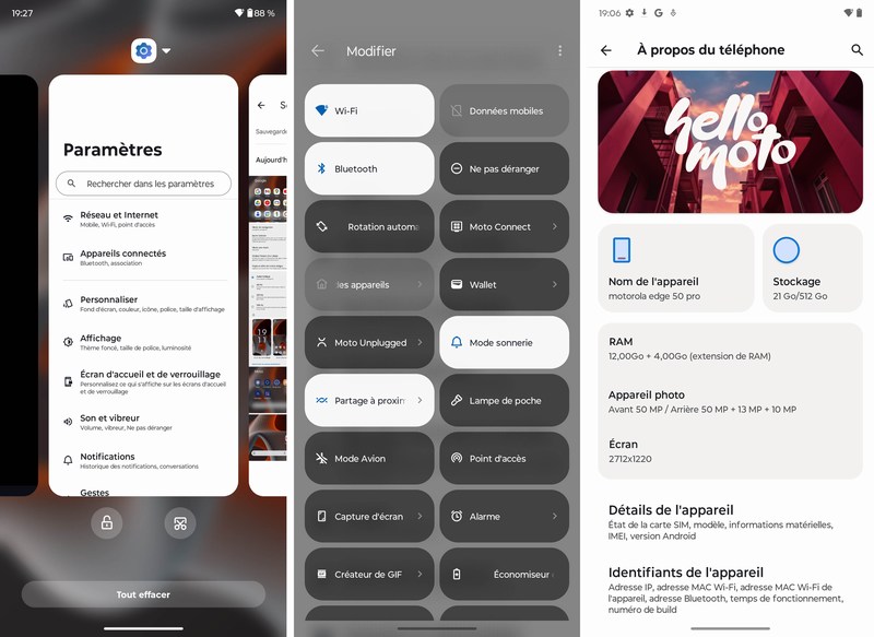 Comme les autres mobiles de la marque, le Motorola edge 50 Pro utilise le système Android, ici en version 14 pour l’animation. Il n’y a pas de surcouche logicielle mis à part quelles applications Motorola préinstallées, ce qui fait qu’on peut avoir l’impression d’avoir un modèle Google Pixel entre les mains. C’est donc épuré, ce qui est une bonne chose. Les versions de la mise à jour du système Google Play et de sécurité dataient du 1er mars 2024, ce qui est satisfaisant lorsqu’on sait que l’appareil a été testé courant avril. Pour lui, Motorola promet 3 ans de mises à jour Android et 4 ans de mises à jour de sécurité. Cela laisse de quoi voir venir.