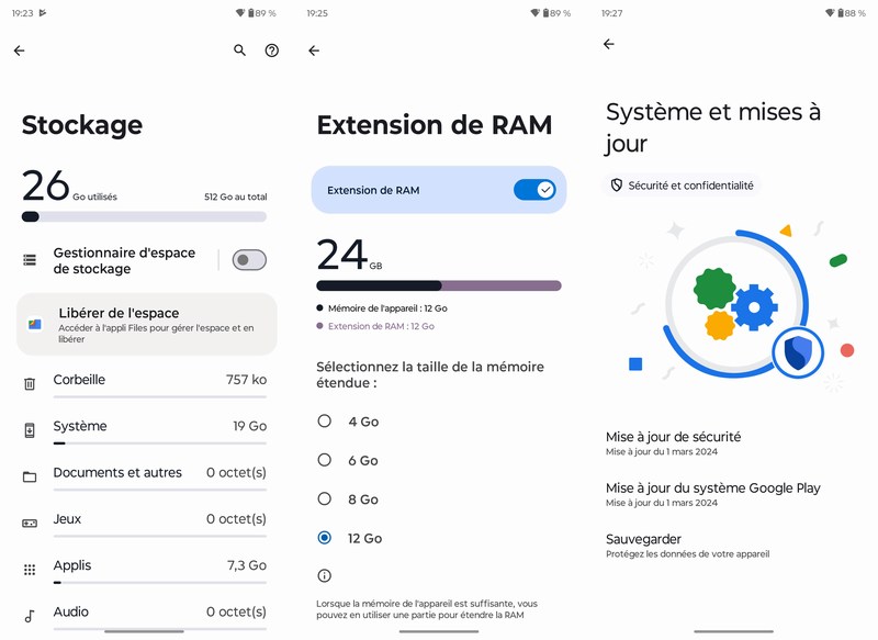 Les paramètres sont très bien organisés, simples, efficaces et assez nombreux pour gérer le mobile. Le système, la surcouche logicielle et les applications préinstallées occupaient un peu plus de 33 Go sur les 512 Go disponibles sur notre modèle de test.