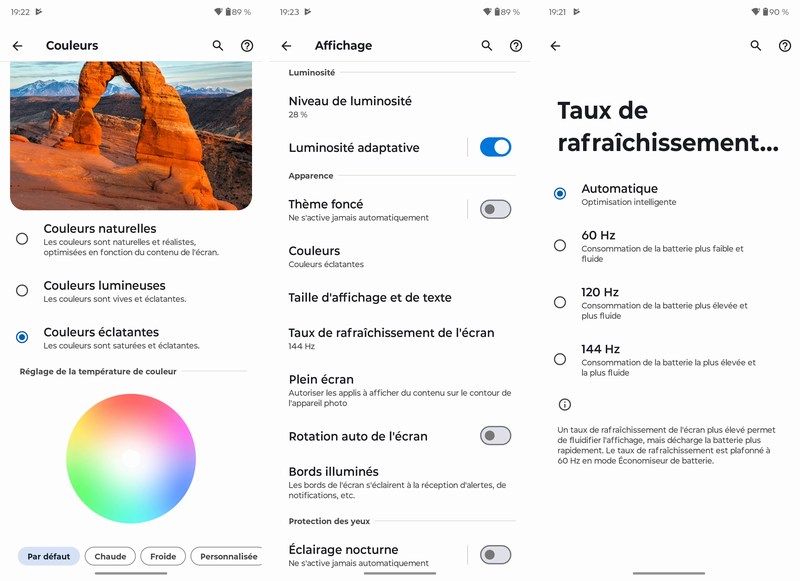 La fréquence maximale est de 144 Hz, soit plus que les autres mobiles actuellement sur le marché à l’exception des modèles gaming comme l’Asus ROG Phone 11 Ultra ou le ZTE Red Magic 9 Pro, par exemple. Cette très haute fréquence permet d’obtenir des défilements fluides pour consulter les pages des sites Internet et les murs des réseaux sociaux. On en profite également dans les jeux vidéo. Dans les paramètres, il est possible de sélectionner la fonction Automatique ou de choisir entre les modes 60, 120 ou 144 Hz avec, pour ce dernier, une consommation supérieure de la batterie.