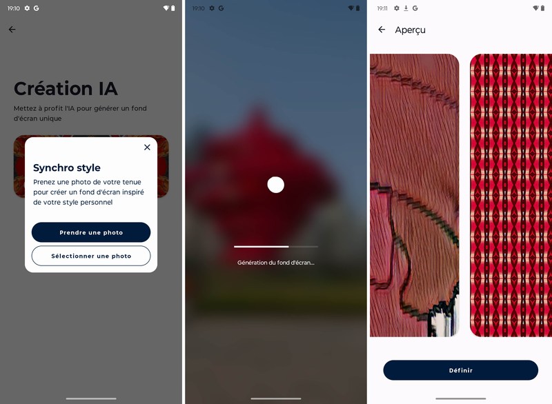 Le téléphone est capable d’utiliser l’intelligence artificielle pour la création de fonds d’écran. Ainsi, il suffit de prendre en photo un vêtement, par exemple ou tout autre objet et de se voir automatiquement proposer des fonds d’écran qui utilisent les mêmes codes couleur.