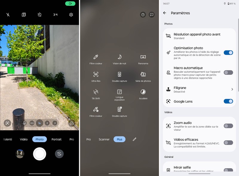 L’application Appareil photo présente une interface très classique. Lors de la première ouverture, on peut choisir entre les modes Amélioration automatique (qui implique un délai de capture plus long) ou le mode Naturel. Sinon, il y a plusieurs options immédiatement disponibles tout en haut de l’écran. Dessous, il y a la zone de cadrage, les niveaux de zooms (macro, 0,5x, 1x, 2x et 3x) immédiatement accessibles puis les modes de prises de vue (Ralenti, Vidéo, Photo, Portrait, Pro, Scanner et Plus). Le menu Plus permet d’accéder à d’autres modes : Filtre couleur, Vision de nuit, Panorama, Ultra-Res, Double capture, Série de photos, Tilt Shift, Longue Exposition, Accéléré, Filtre couleur (vidéo) et Double capture (vidéo). On peut personnaliser l’interface avec des modes préférés.